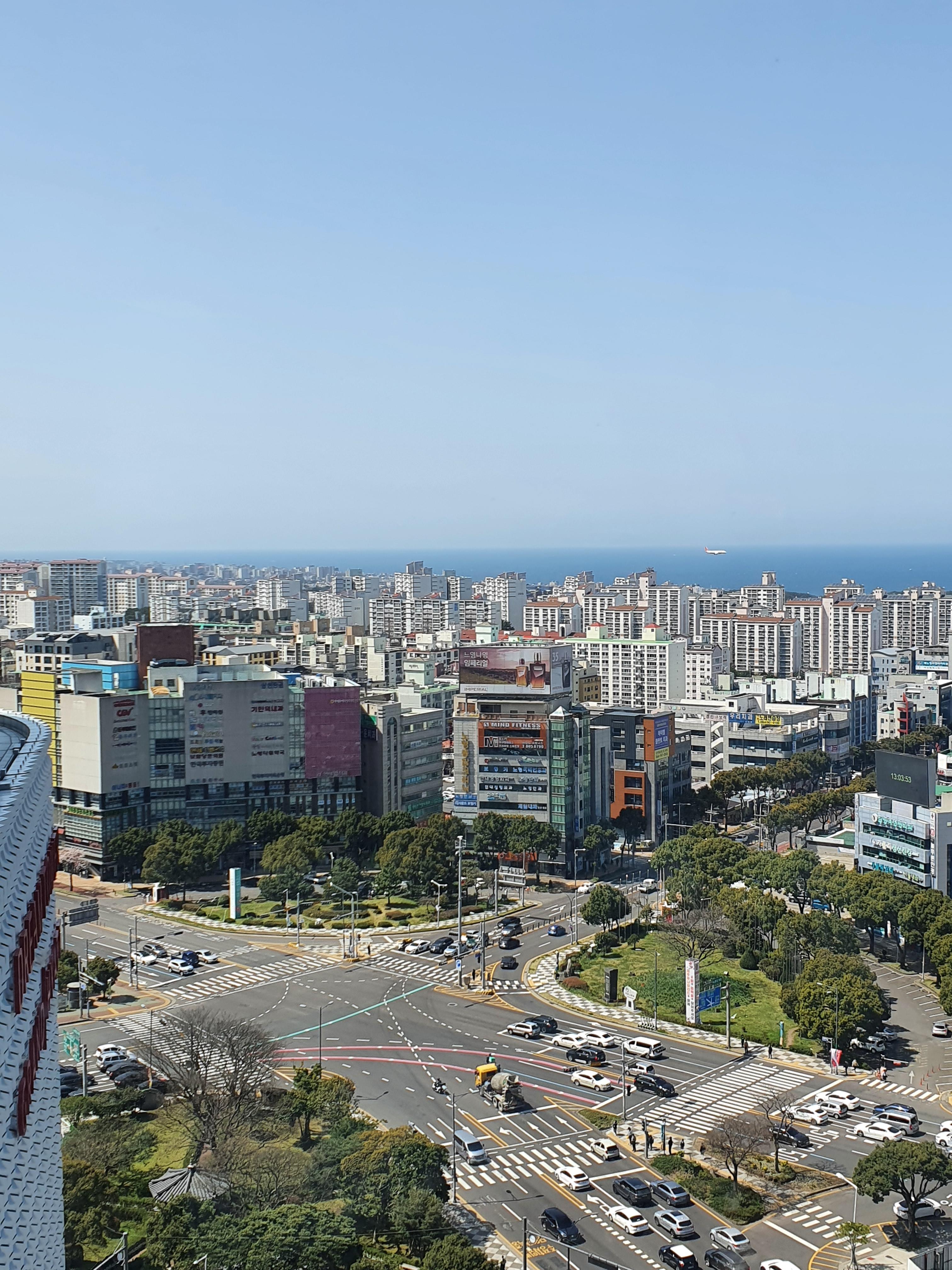 제주도에서 가장 높은 건물이라 그런지 시야에 걸리는 것 없이 멀리 제주 바다가 한눈에 들어오는 아름다운 뷰의 창가 자리로 안내를 받았다. 서울에 있다면 그다지 높은 건물이 아니겠지만 제주도에서, 게다가 공항 근처에서 이렇게 높은 건물을 지을 수 있었다는게 신기한 일이라는 생각이 들었다. 멀리 비행기 날아가는거 발견하셨나요?!