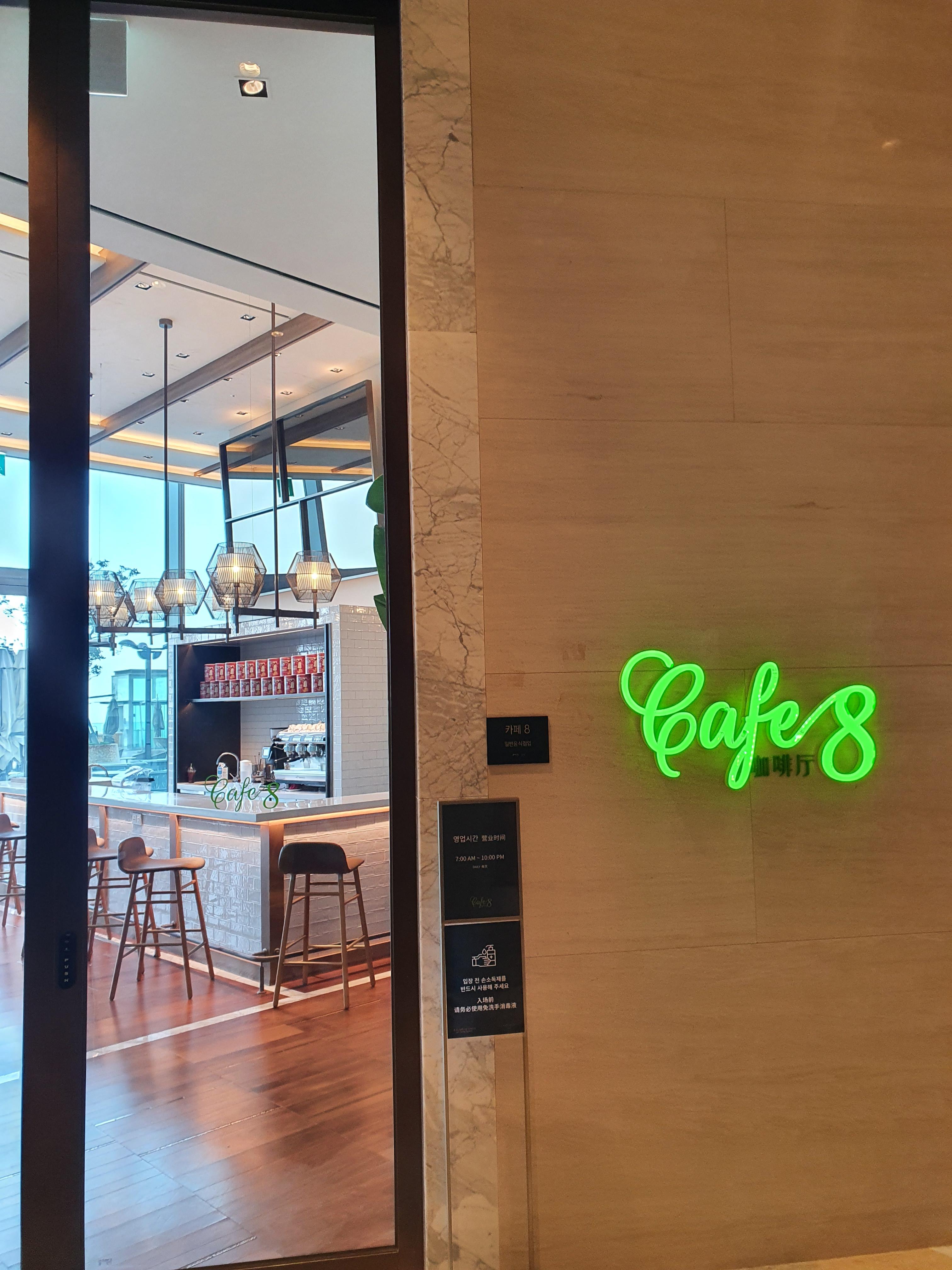 그랜드 하얏트 호텔 제주의 야외 수영장도 같은 층에 위치해 있어, 엘리베이터에서 내리면 정면에 수영장이 눈에 들어오고 카페8은 오른편에 위치해있다. 호텔 숙박객의 조식도 카페 에잇에서 이용할 수 있었는데 우리가 방문했을 때는 조식 마감 후 런치와 디너로 운영되고 있었다. 카페 8의 런치 영업시간은 11시부터 밤 10시까지이다.