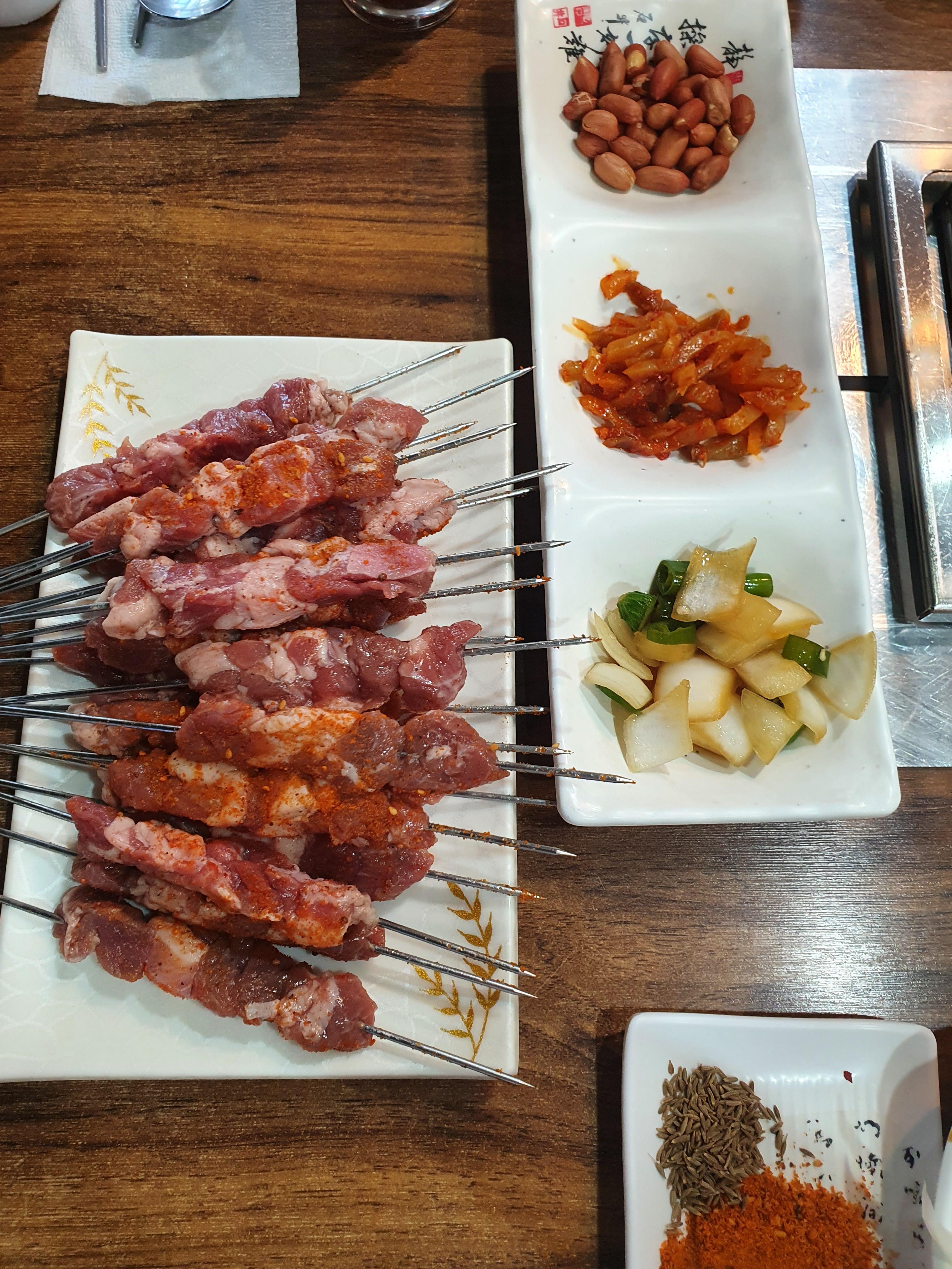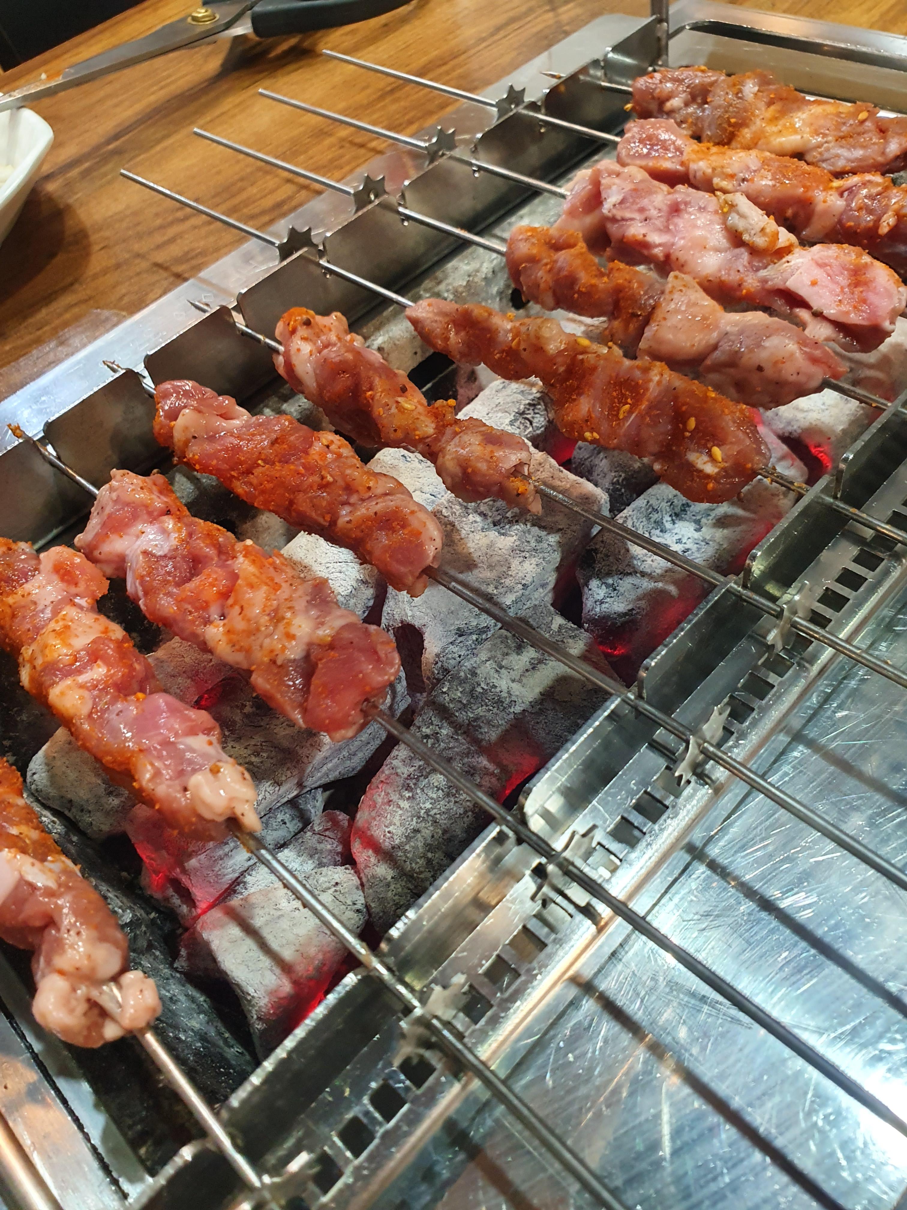 기본적인 테이블 세팅은 양꼬치를 먹기에 최적화 되어있다. 숯을 피워 숯으로 양꼬치를 구워먹는데, 자동으로 돌아가며 양꼬치를 골고루 구워주어서 뒤집거나하는 불편함이 없이 편하게 먹을 수 있다.