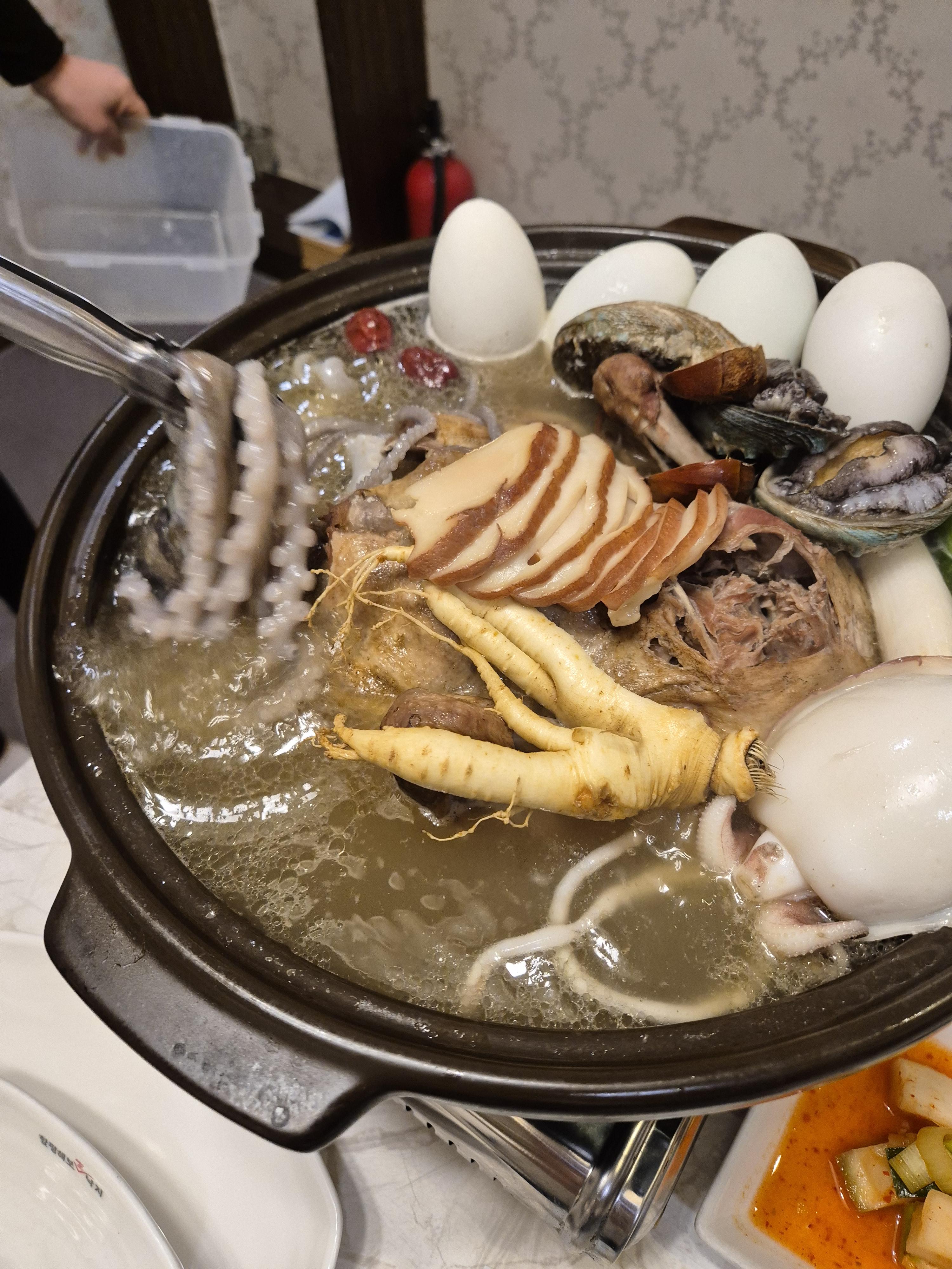 오리에 낙지, 전복, 산삼, 인삼, 오가피, 엄나무, 황기, 당귀, 밤 등 한약재가 들어간 제대로 몸보신 음식이라고 보시면 됩니다. 오리알도 쪼르륵 올라가있는데 양이 많아서 오리알은 따로 포장해와서 먹었어요.
