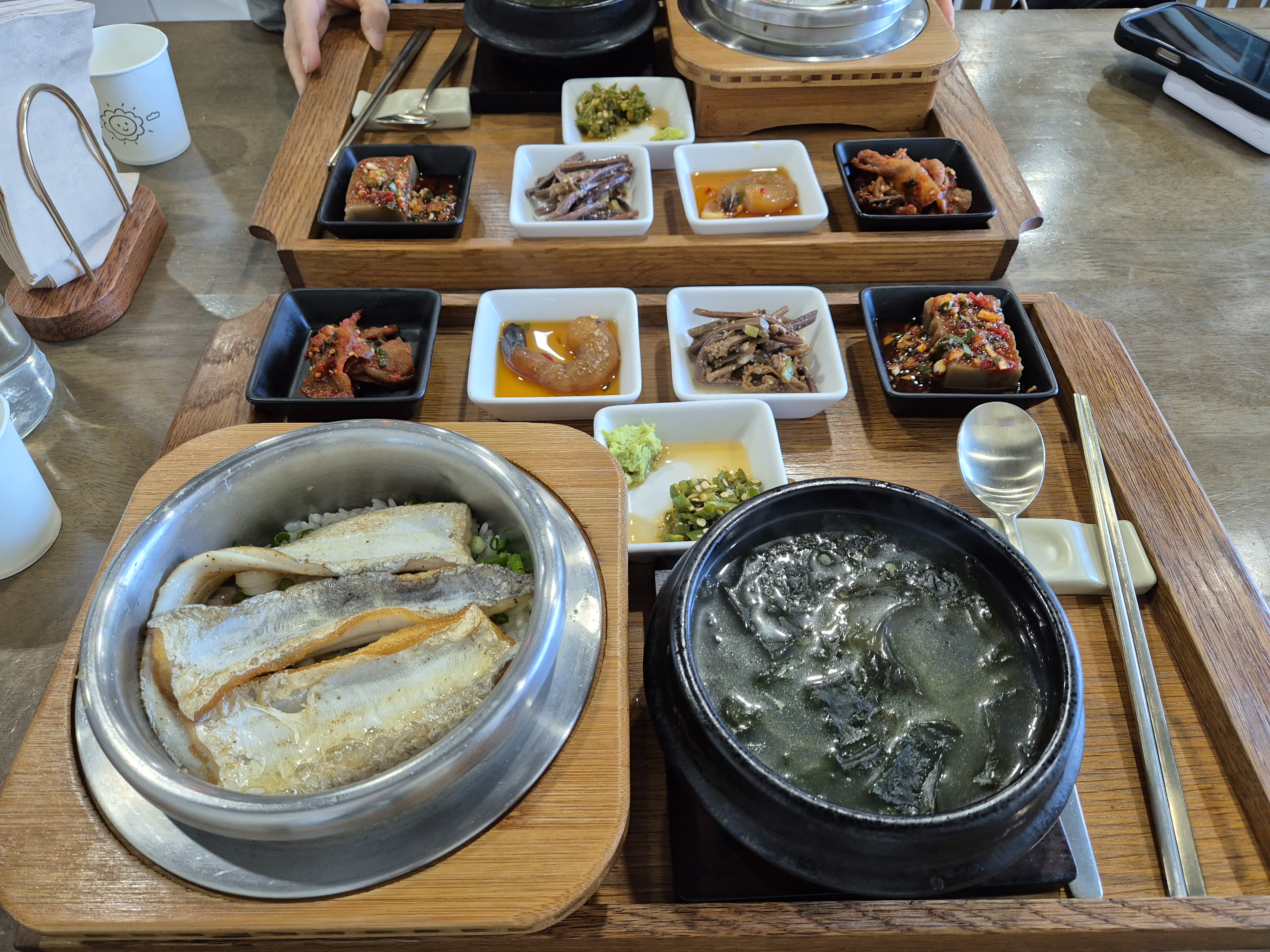 메뉴는 갈치솥밥, 전복솥밥, 흑돼지솥밥 세가지인데, 1인분씩 반찬까지 깔끔하게 나와서 담백으로 결정했다.