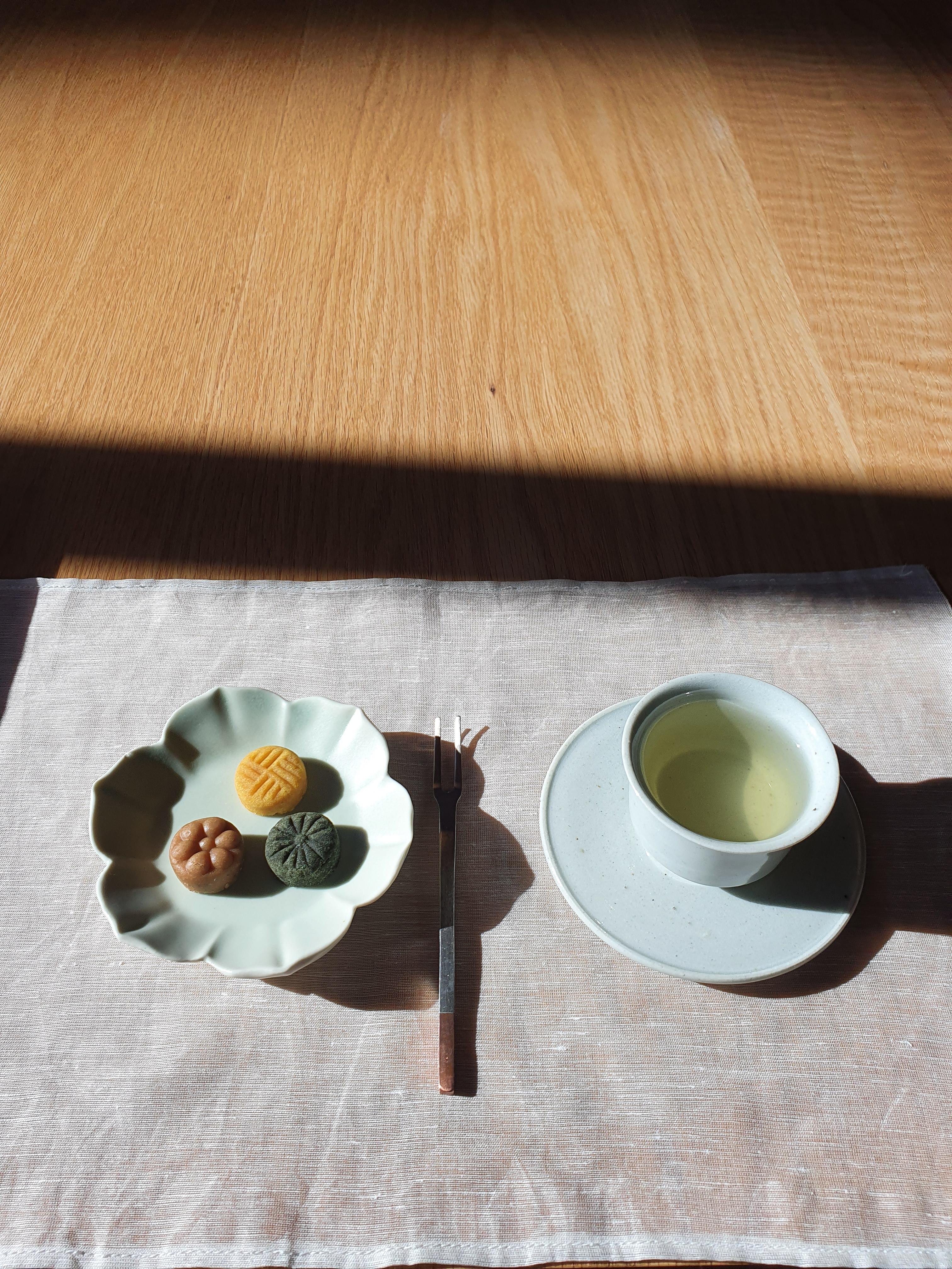 서로 다른 세 녹차와 그에 어울리는 단정한 다식으로