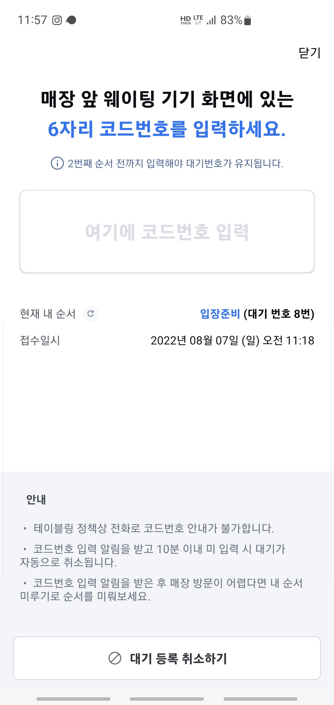 가게에 도착해서 매장 웨이팅 기기에 있는