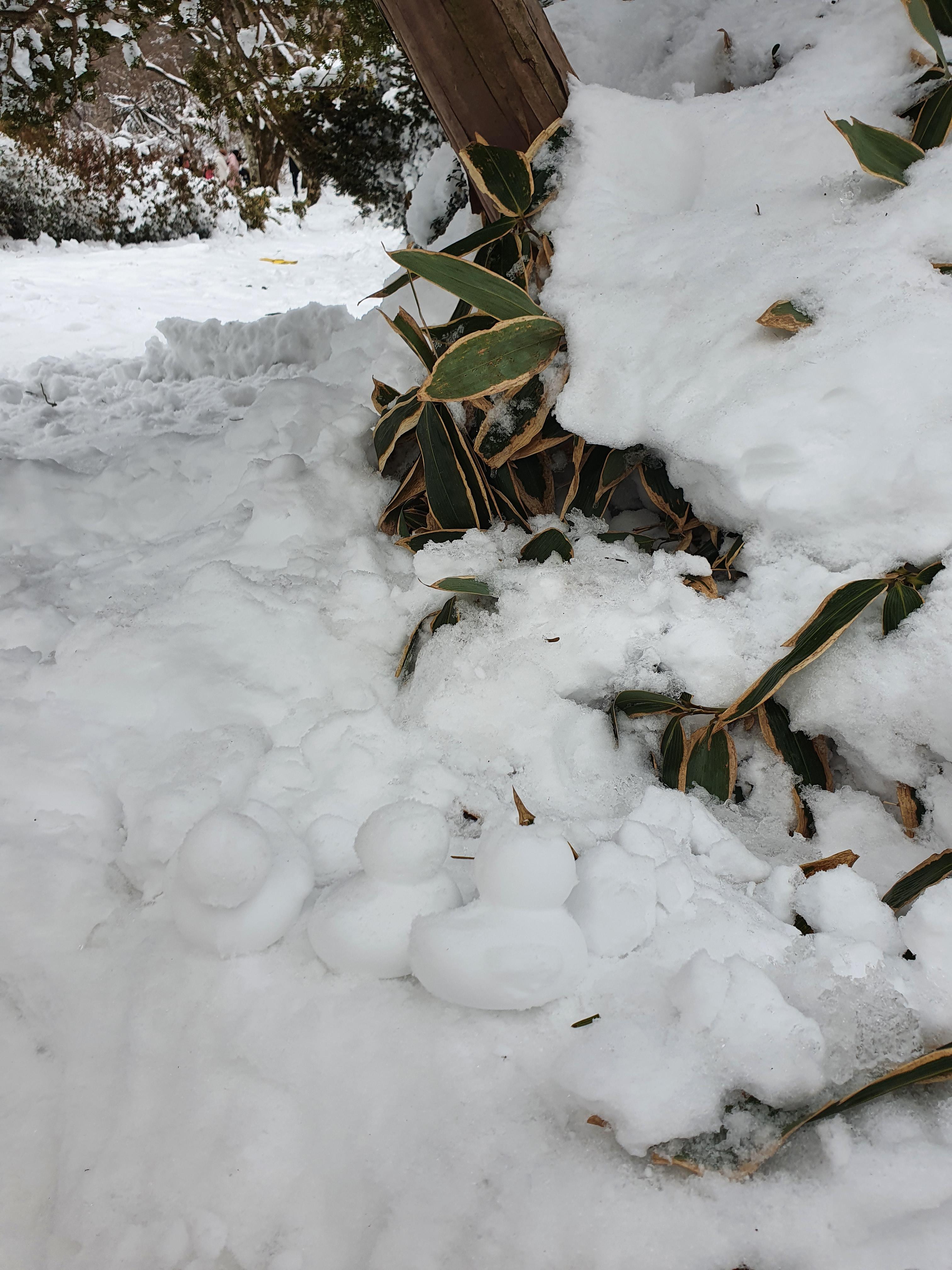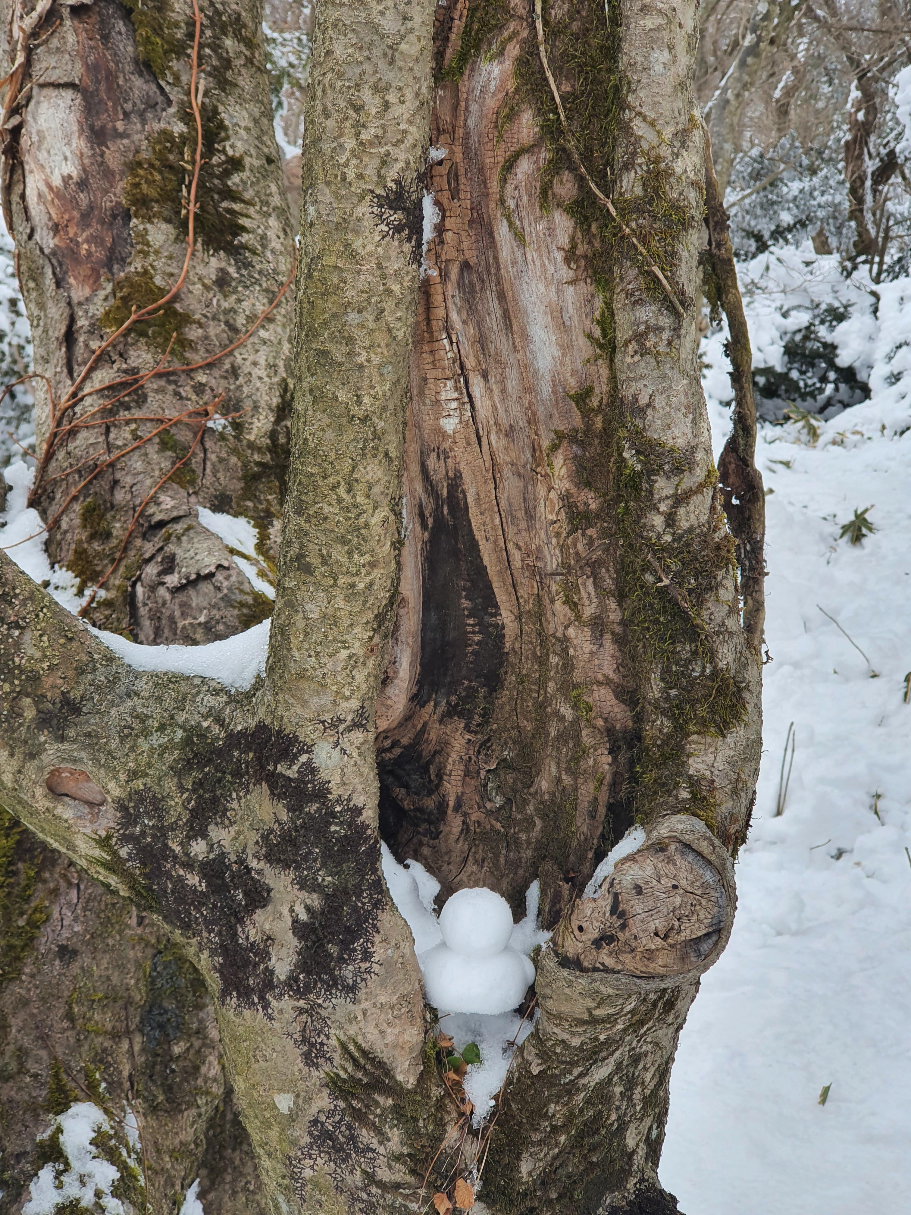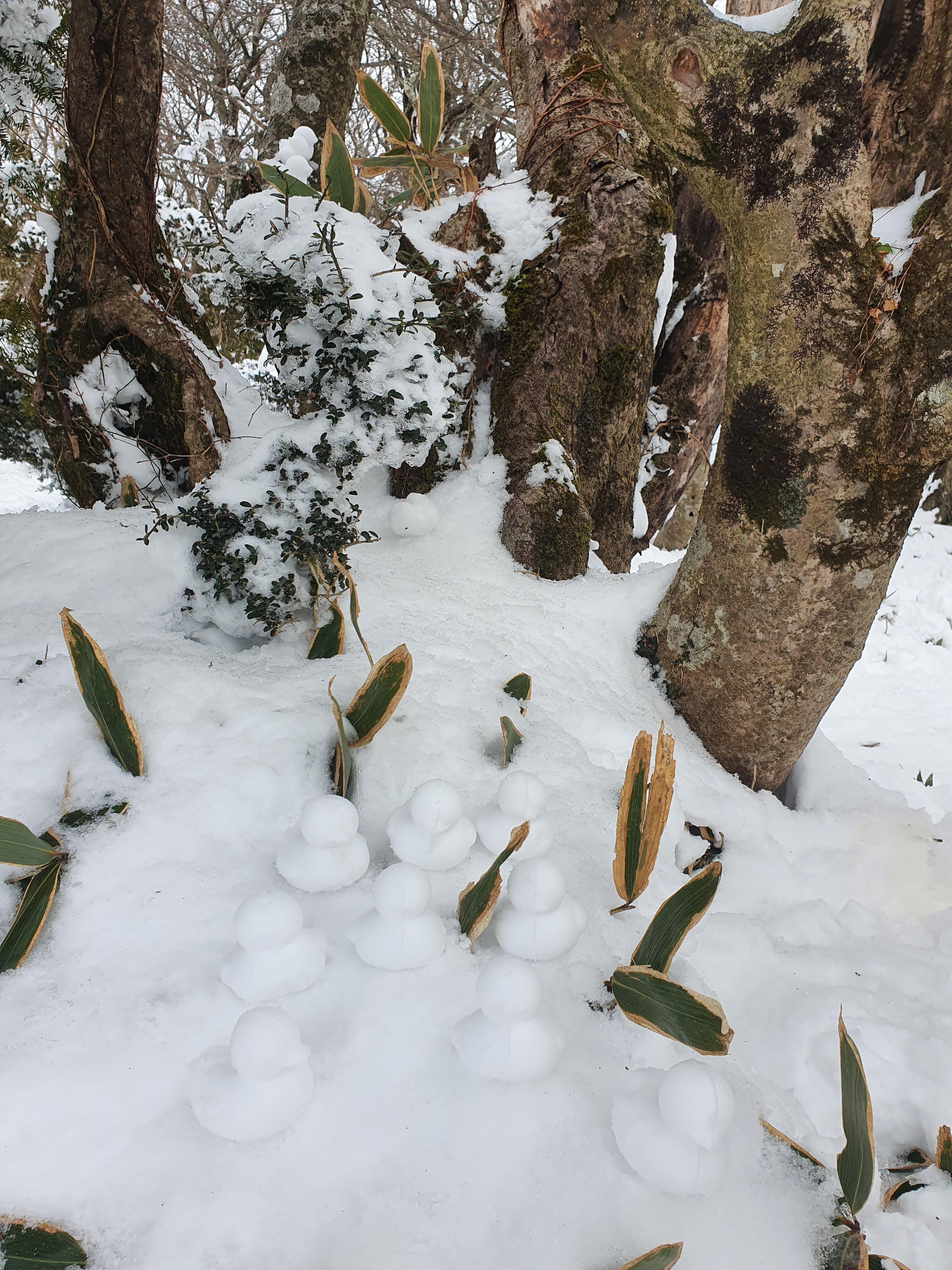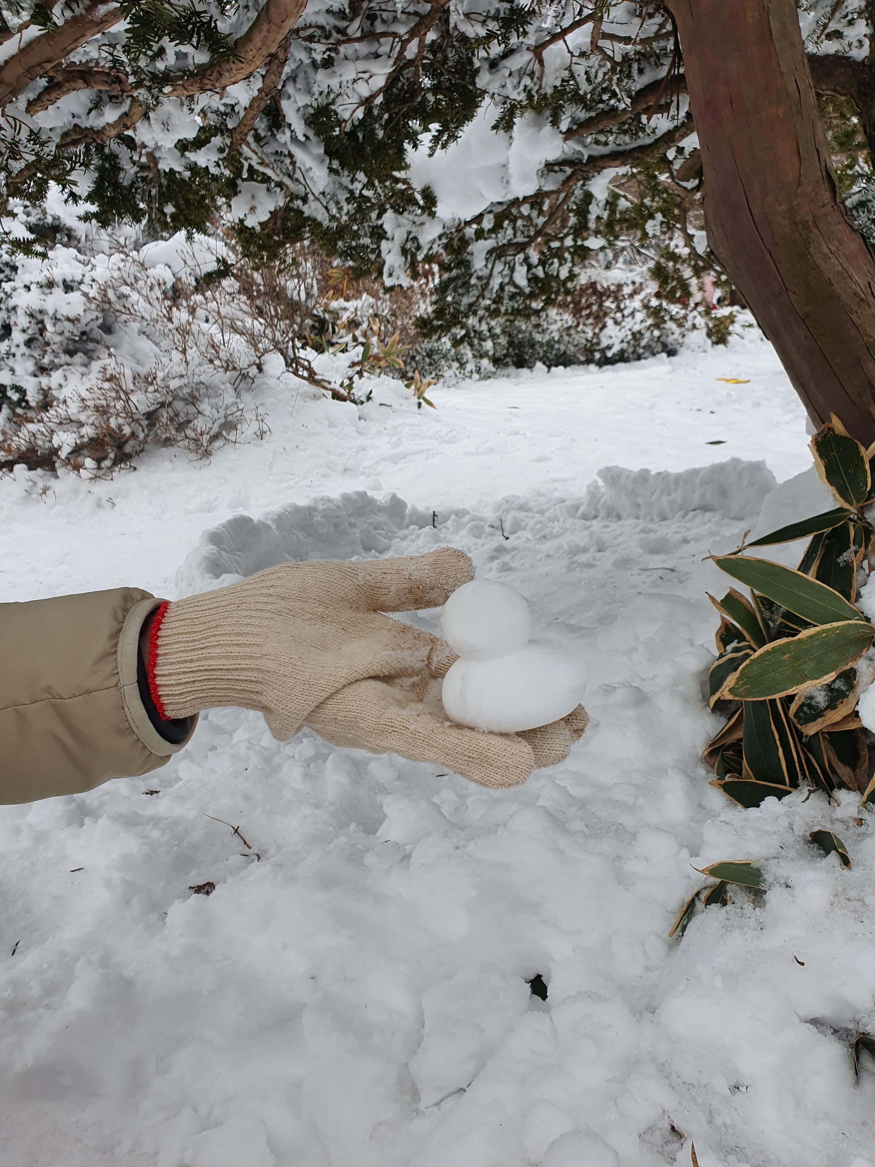 나뭇가지 위에 눈오리 한쌍을 만들어 올려두고