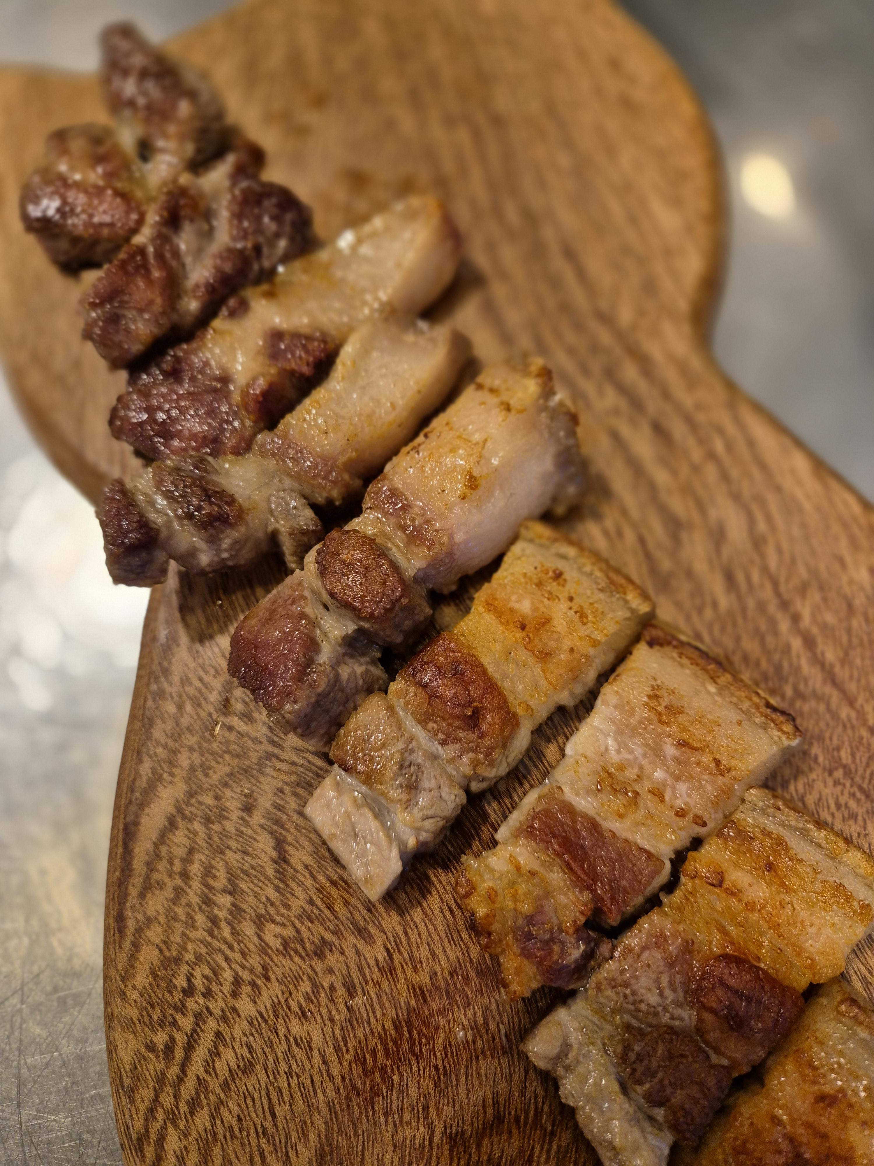 껍질이 붙어있고, 비계와 살이 겹겹이 있는 오겹살은 쫀득하고 고소함이 이루말할 수 없고, 먹자마자 우와 하는 소리가 나왔던건 목살이었습니다. 저 두께 보이시나요? 비계없는 부분을 먹었는데도 입에 넣는 순간 가득차는 육즙과 육향, 성공의 맛이 이런건가 싶더라고요.